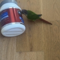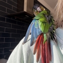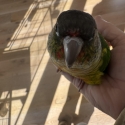 Peewee is affectionate, loves snuggles and training, flys around the house and showers in the sink. Makes friends with strangers easily.