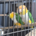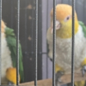 Male flew away, so shes housed with my black cap Caique for now.Need to make room for other birds.