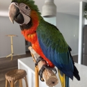 She is a hybrid from a very large Blue and Gold and Scarlett Macaw parents (photo included) and has been raised from the egg in our home .