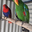 Eclectus Unrelated / Bonded pair, bred and hand-raised by me from different parent birds. Been together since 6 weeks old. Male & female are just over 3 years old female has leg ring they have been in the avairy for just over a year, female has started to work the box. Will make future breeders both parents are profilic breeders. Stunning healthy big birds.Both birds are comfortable taking food from the hand and enjoy gentle scratches. Both talk. Reason for sale need the Room for different species.