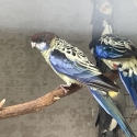 A unrelated young pair of Northern rosellas. Cock bird is 2 years old, hen bird is 7 months old. Young hen still has juvenile red feathers on her head.