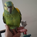 Blue fronted Amazon's hand raised
