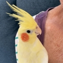Hand raised cockatiel, around 5 months old. We believe it to be a female. We Handraised it ourselves. Due to a move we need to downsize our bird collection. Tame bird, loves to come out of cage daily, sits on shoulder whilst doing things around the house. Answers to the name Yolkie.